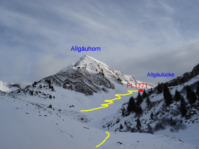 Start Hintere Schönisei 1095m beim Parkplatz. Der Aufstieg via Mirrenegg - Ällgäuli - Stüssibode 1860m - Auf dem kleinen Plateau rechts westwärts bis fast an den NW-Grat, der vom Gipfel hinabzieht. Nun in einigen Spitzkehren den steilen NW-Hang hinauf und zuletzt unter dem Gipfel auf den NW-Grat und die letzten Meter auf den Gipfel.