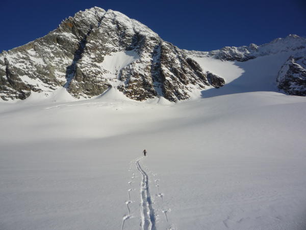 Das Italientief hat ganze Arbeit geleistet und perfekte Schneebedingungen geschaffen. 30 cm Pulverschnee auf Altschneedecke. Kein Steinkontakt. Gletscher tief eingeschneit. Glocknerleitl mit Ski begehbar. Dorthin allerdings kurze, eisige Querung (Steigeisen)! Grat selbst Pulverschneeauflage auf Fels(platten). Glocknerscharte viel Schnee und überwächtet. Wir sind die Adlersruhe aufgrund der guten Verhältnisse linker Hand über Steilhang umgangen. Hang wird über kurze, leichte, felsige Querung verlassen, ansonsten Normalweg zur Hütte benutzen. Pallavicinirinne bis auf die letzten 3 Seillängen durchgehend Schnee.