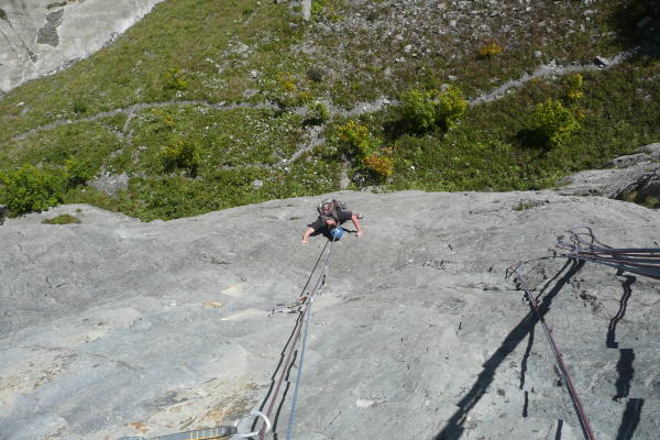 Weil wir noch Zeit übrig hatten sind wir daraufhin noch in die Meteorit eingestiegen (6a, 7 Sl.). Auch sie eine schöne Route, jedoch merklich einfacher als die anderen beiden. In älteren Kletterführern ist die Route mit 5c+ bewertet. Seitdem die letzte Seillänge eine neue Routenführung bekommen hat, ist diese jedoch 6a.