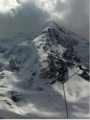 über Coeur Von Cabane de Mountet Aufbruch gegen 2:00 über Durand-Gletscher zum Coeur auf Band und Traverse bis zum Ende des NNE-Grats. Wegen tw. hüfthohem Pulver kein Weiterqueren in den Firnhang. Weiterer Aufstieg am Grat selbst bis ca. 3400, was trotz recht viel Schnee gut machbar ist. Zweiter Traversenversuch auf Höhe Gletscherplateau wg. weiterhin viel Pulver erneut frustran und Abstieg in Aufstiegsspur.