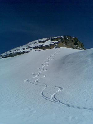 Fantastisch! 20-30cm feinster Powder auf tragender Zwischenschicht. Null Steinkontakt. Weder Steigeisen, Harscheisen oder Gletscherausrüstung nötig. Warum wir nach 14 Tagen Dauersonne die ersten auf diesem prächtigen Skiberg mit grandioser Aussicht waren, ist uns ein Rätsel.