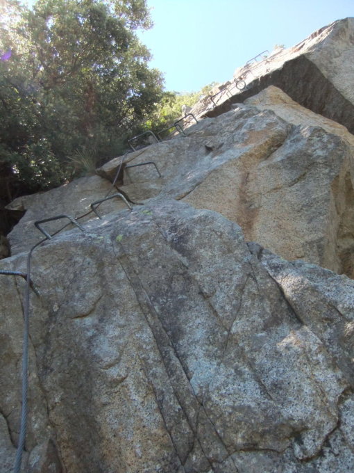 anscheinend finden seit längerem Sanierungsarbeiten an den Nachbarfelsen statt, welche gegen Sturz mit Fang-Stahlgeflechten und Seilen verankert werden. Das Felsgebiet ist zwar nicht brösilig, aber auch nicht gerade kompakt...
