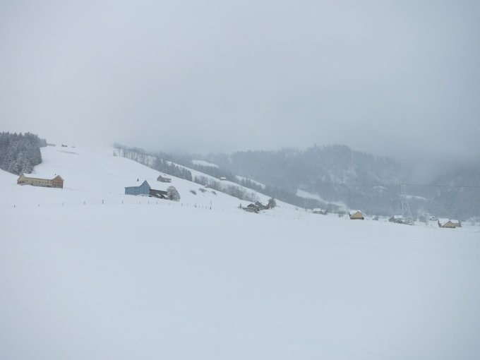 Start um 8:30 bei -3°C und leichtem Schneefall. Gute Skispur vom Parkplatz weg. (Danke dem Frühaufsteher!). Viel Neu- und Triebschnee, (vom gestrigen Föhnsturm der in Brülisau mit bis zu 119km/h getobt hatte). In der Spur abschnittweise noch ca. 25 cm Einsinktiefe. Skitüreler hat auf 1‘500 Mt. gedreht; von da an teils apere Strasse und teilweise bis Mitte Oberschenkel Solo-Spurarbeit. (Das MIT Schneeschuhen!) Schneefall auf der ganzen Tour und Nebel wurde zusehends dichter. Auf der Kamorstrasse bin ich von Pfosten zu Pfosten gegangen, sonst grau in grau. Starke Bise, dadurch zusätzliche Schneeverwehungen…