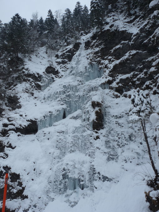Es hat Eis aber noch wirklich nicht viel. Die Absicherung ist meist anspruchvoll. Vorstieg erfordert Können und gute Einschätzung. Viele Passagen sind erst mit einer dünnen Eisschicht überzogen und viele Schneeeinschlüsse im Eis lassen die Pickel durchrutschen. Diverse Stellen sind auch noch offensichtlich wasserunterspühlt und man sollte aufpassen nicht plötzlich im Bach zu stehen. Oft liegt Schnee auf dem Eis. Die Seez ist noch komplett offen aber an diversen Stellen kommt man recht gut hinüber.