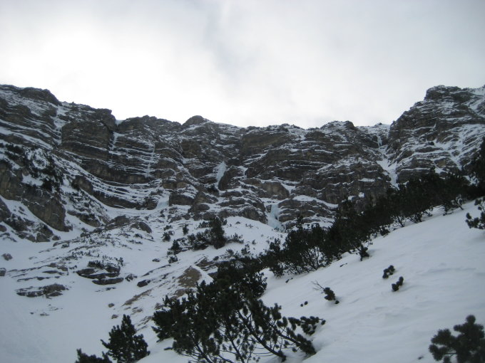 So ist es in der Tourenbeschreibung angegeben! Wir haben diesen Stand nur als Zwischensicherung verwendet und haben 10 m weiter oben nach Schneestapfen wieder am einer kleinen Eissäule Stand bezogen!