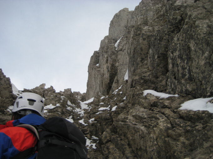 Nun ist die beschriebene "Heimatliebe" gefragt. Wühlpassagen im Schnee machen einem das Leben a bissl schwer. Die M 3 Passage ist fast Schnee und Eisfrei und kaum abzusichern. Wir sind die "Entlausungs-Ausstieg Variante" nach rechts hinaus zur Schulter gegangen. Auch hier nur noch Wühlschnee.