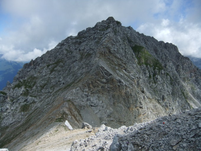 Vom Gipfel bietet sich ein schöner Rückblick auf den Felsgrat (über den der Taja-Klettersteig zieht) und den Südgipfel des Vorderen Tajakopfes.
