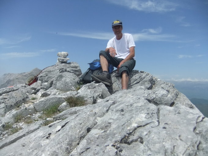 Ich versuchte nach der Ferrata R. Malfatti den Mte. Sella zu umrunden über die Via Ferrata Francesco Vecchiacchi. Doch der Steig ist seit Jahren gesperrt und seinem natürlichen Verfall preisgegeben. Die Seilanker sind abgebrochen und Sicherungsseile vielmals gerissen. Tour hatte ich dann abgebrochen und bin umgedreht vor erster Ostrinne und zurück zum Einstieg. Von dort folgte ich dann über alpinen Steig blauen Strichmarkierungen unschwierig zum grasigen Buckel von Süd- und Nordgipfel.