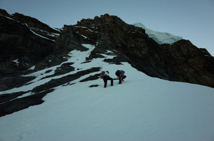 Solange noch soviel Schnee liegt, dürfte die abschüssige Kalkplattenflanke (3150m-3400m) bei kalten Nächten mit gefrierendem Schmelzwasser ziemlich heikel werden.