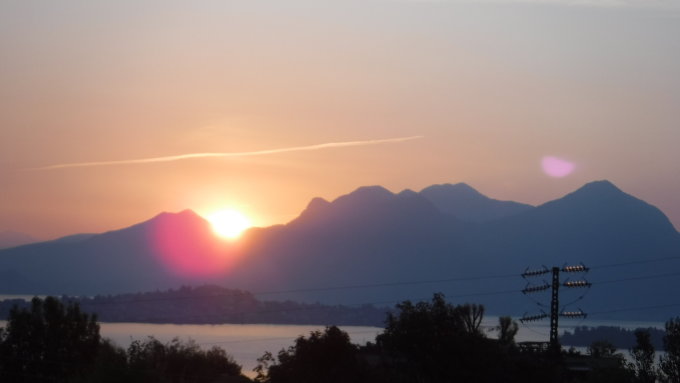 Tourenbeginn um 07:25 Uhr bei 13°C unter wolkenlosem Himmel bei Sonnenaufgang in sich darin spiegelnden Lago Maggiore.