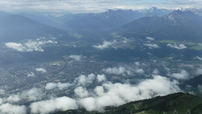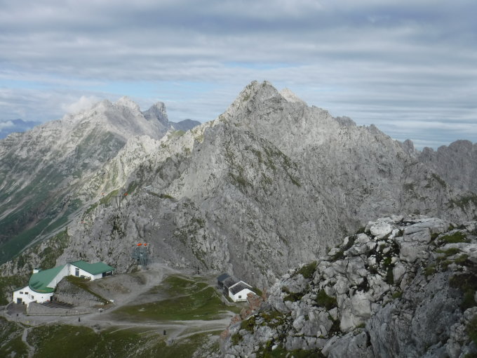 Die Wetterprognose war äußerst wechselhaft und das Wetter sah instabil aus. Darum suchte ich eine Route aus, auf der es Fluchtmöglichkeiten gab und schnelle Rückzugsmöglichkeit (Seilbahnnähe). Tourenbeginn um 08:45 Uhr im Hafelekar bei 14°C und heiterem Wetter. Während des Vormittags kamen aus dem Inntal immer wieder Nebelwolken hoch. Prognostizierte kurze Regenschauer gab es jedoch keine.