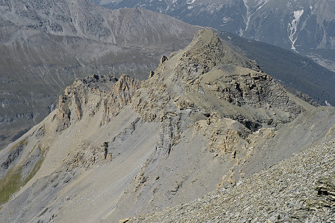 Ausgeprägter, aus brüchigem Fels und viel Schutt gebauter Westsüdwestgrat zum Col du Lou.