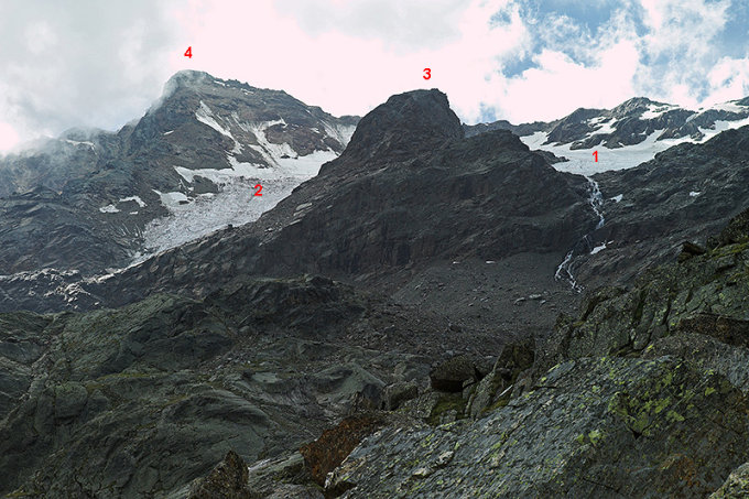 Der Aufstieg zieht nun auf wenig ausgeprägter Pfadspur in einem Bogen westwärts haltend über Schutt und mitunter steilere Schrofenstufen empor, worauf man nördlich eines auffallenden, mit einer Markierungsstange versehenen Felssporns die nördliche Zunge des Weissbrunnferners erreicht.