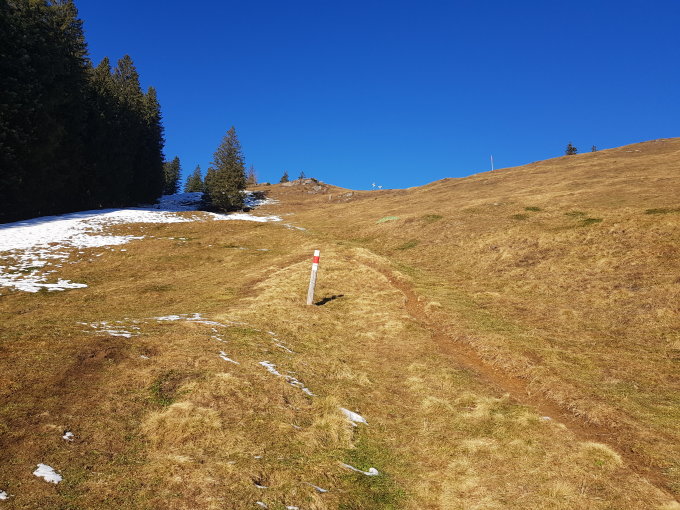 Bis kurz vor Halsegg kein Stäubchen Schnee. Am Morgen noch gefrorener Schlamm, der dann wohl am Nachmittag getaut ist. Entlang der Krete zum Wildspitz ca. 70% geschlossene Schneedecke. Keinerlei Schwierigkeiten mit Wanderschuhen. Abstieg vom Wildspitz bis Obhegkapelle zu Teil auf schneebedecktem Weg (aber kein Schnee links und rechts des Weges). Dann wieder trocken, wenn auch zum Teil leicht schlammig. Es hatte viele Leute unterwegs, darunter auch viele Mountainbiker, die das ganze Gebiet befahren haben, nicht nur die Fahrstrasse zum Wildspitz. Es gab auch Trailrunners.