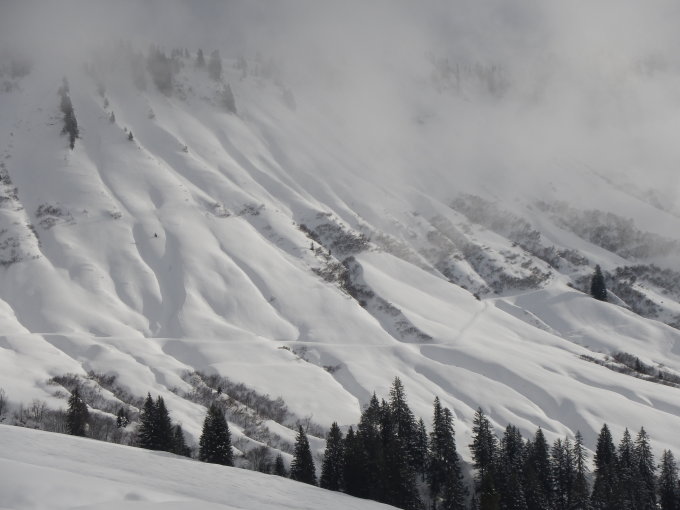 Richtung Bergkamm in südwestliccher Richtung. Kurzer Aufstieg auf den Bergkamm. Nun phänomenale 35° direkt Abfahrt, geradeaus weiter bis zum 3. Abfahrtshang. Wiederum ca. 35°, spannend bis zur Furkastrsse .Eine der schönsten ALPINEN Schlittentouren im Bregenzer Wald/ Vorarlberg !!!