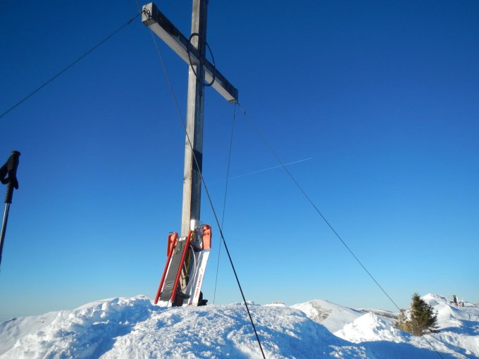 Im Gipfelbereich ca. 10cm Pulverschneeauflage auf hartgefrorener Grundschneedecke.