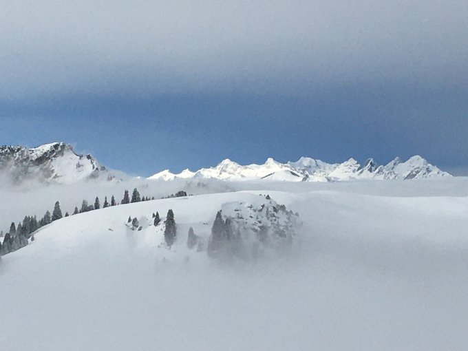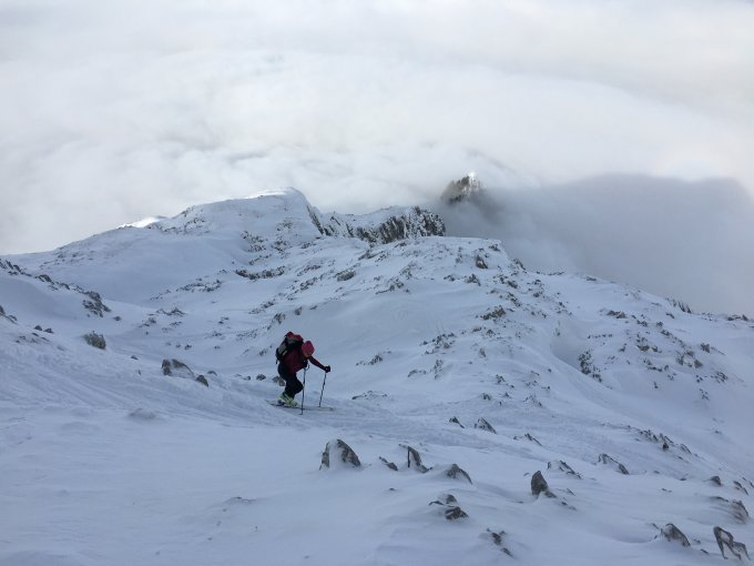 Überschreitung Meniggrat - Stand - Seehore Aufstieg ab Parkplatz Meniggrund, zunächst auf den Meniggrat in den Wolken - es hat viel weniger Schnee als in den letzten Jahren, grösstenteils "festerer Pulver". Der Meniggrat war über der Wolkendecke, es gab noch eine Hochbewölkung, die eine fantastische Stimmung erzeugte. Über Stand (1939m) zur Seehore (2282m). Es schauen noch ziemlich viele Felsen aus dem Schnee, siehe Bilder. Abfahrt war gut möglich, allerdings liess sich ab und zu Steinkontakt nicht vermeiden. Gegenaufstieg zum Stand und Abfahrt in den Meniggrund.