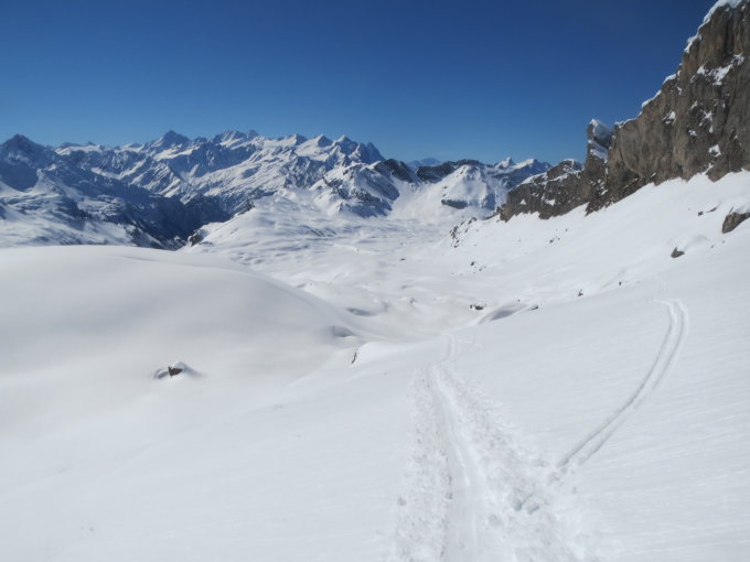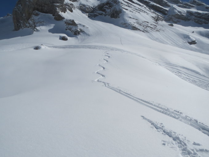Südhänge schon gut verfestigt, Gipfelkalotte dick eingeschneit. Abfahrt bis Heufrutt in Nordexposition pulvrig. Die letzten 250 Hm zur Stöckalp noch genügend Schnee aber sehr weich, nicht gesetzt, auf sehr steinigem Untergrund.