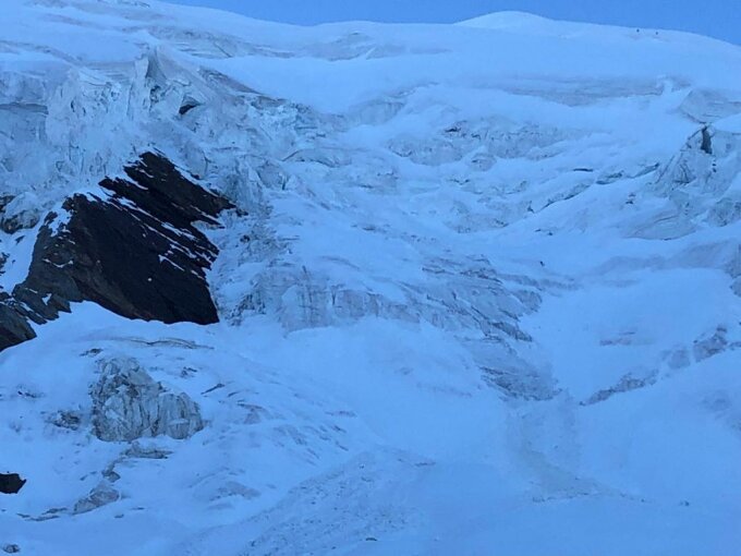 Jedoch ereignete sich um 6.45 Uhr auf ca. 3650m ein Gletscherabbruch (siehe Foto kleiner Kreis) mit anschliessender Schneelawine. Wir wussten zuerst nicht wohin der Abbruch und die Lawine fliessen wird (links oder rechts an uns vorbei). Die Lawine blieb zum Glück 200m oberhalb von uns stehen. Jedoch rollten viele Eis- und Schneestücke ca. 500m weiter als die Lawine. Ein Eisstück traf ein Mitglied unserer Seilschaft und verletzte sie leicht am Unterschenkel.