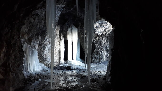 Tunnels gut begehbar, zwei "Engstellen", Steigeisen bei etwas Vorsicht nicht unbedingt nötig (aufgrund mangelnder Vorsicht hat es mich allerdings zweimal auf den Arsch gehauen). Stirnlampe!
