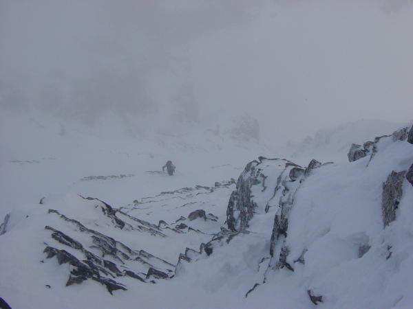 Bei sehr guten Verhältnissen (sprich ausreichend Schnee, im Frühling) kann die NE-Flanke sicher problemlos mit Ski befahren werden. Heute war für uns weder Zeitgewinn noch Nutzen einer solchen Aktion erkennbar. Mit den zahlreichen, noch nicht ausreichend verschneiten Felsen wäre es auch heikel und wohl (zu) wenig spassig gewesen.