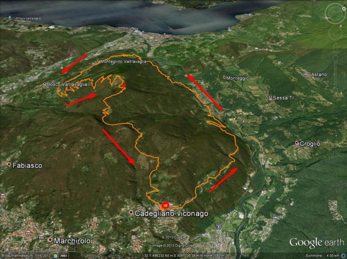 Viconago (480m) (über Ponte Tresa) - Camer - Avigo - Cremanaga - Casa Mirabello - Montegrino - Bonera - Monte sette Termini (972m) - Colle della Nave - Alpe Cugnolo - Viconago Für hervorragende Detailbeschreibung (samt Karte): "Mountainbike Erlebnis Ticino" von Vital Eggenberger --> Tour 26