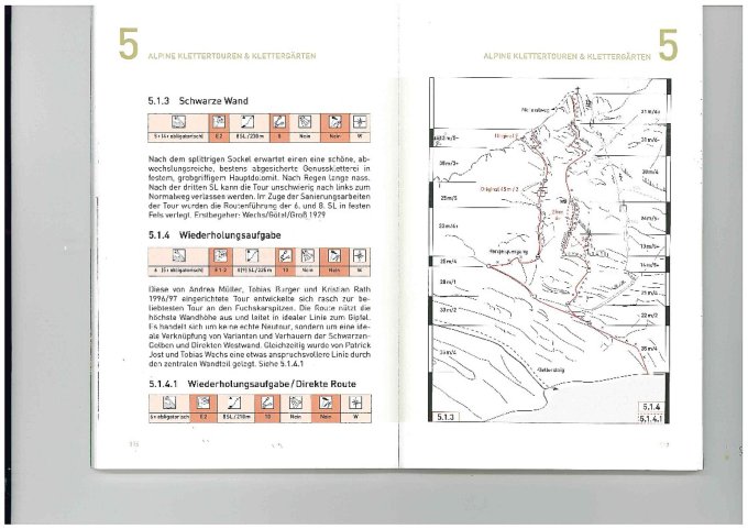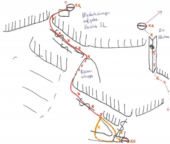 Irgendwann im letzten Winter ist am Beginn der vorletzten Seillänge eine Felsschuppe weggebrochen, über die man so schön zum ersten Haken klettern konnte. Herausgekommen ist splittriger Bröselfels. Wir haben am Sonntag, 31.8. dort einiges an Bruch hinuntergeworfen und zwei Haken gesetzt, so dass man nun wieder sicher klettern kann. Je nachdem wie man diese SL nun beginnt ist der Fels entweder brüchig oder der Seilverlauf unvorteilhaft. Es ging aber irgendwie nicht anders. Es handelt sich jedoch nur um wenige Meter. Der Rest der Tour bietet durchwegs schöne, steile und gutgesicherte Genußkletterei im steilen Hauptdolomit.