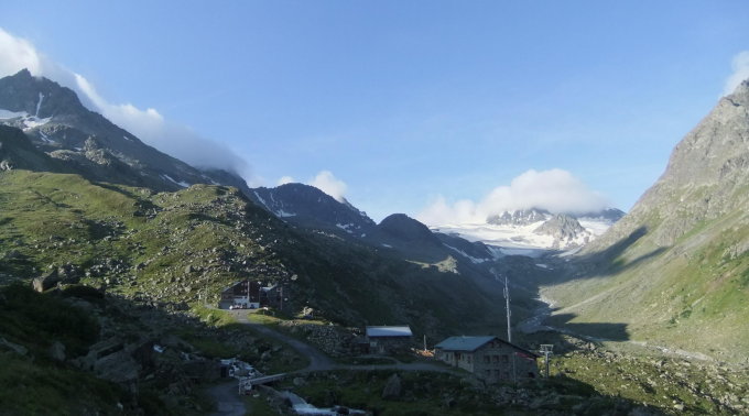 Nachts sternenklar. Vollmond. Morgens bestes Sonnenwetter. Mit Beginn des Abstiegs um 10:30 Uhr setzte angekündigter Schauer ein, der sich zum dichten Regen entwickelte. Mein alter Südwester bot bestens Schutz dagegen. Gerade bei der rasanten (aber nicht steilen) Abfahrt mit dem Velo.