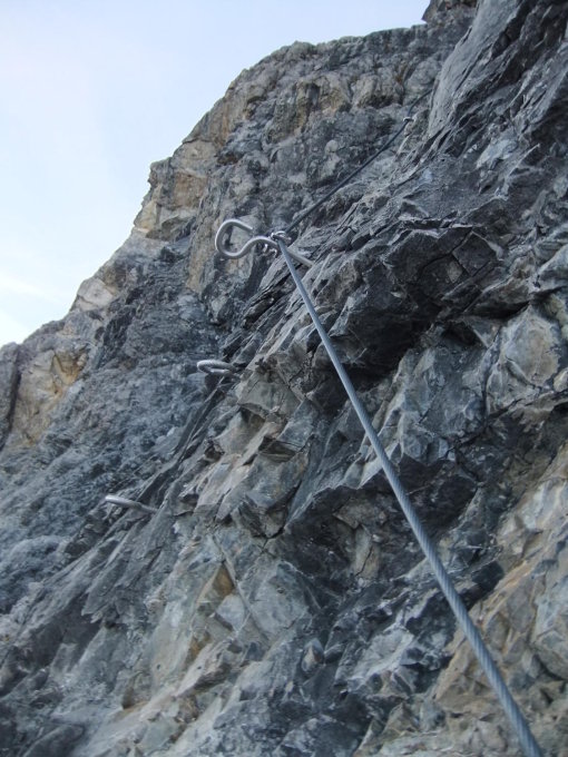 Moderater Klettersteig (romanisch: Senda ferrada) aus Mischung aus Sportsteig mit über 200 Trittbügeln und dennoch alpinen Charakter auf den "Eiger der Bergüner Stöcke".