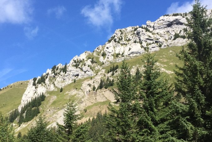 4.+5. Zwei überhängende Türme werden rechts umgangen. Dazu muss man ev. leicht nach rechts absteigen und unter dichten Bäumen durch bis eine grasige Rinne den Wiederaufstieg erlaubt.