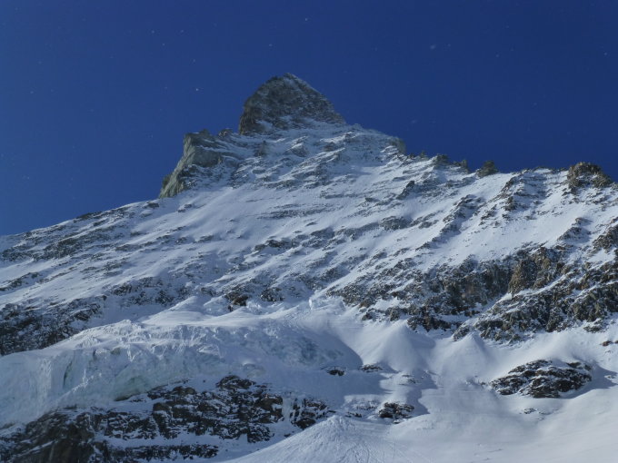 Aufstieg in der Ostwand bis ca. 4000 m. Dann nur mehr Pulverschnee auf Platten, sodass von dieser Höhe abgefahren werden musste. Verhältnisse gut bis sehr gut, sprich Pulverschnee mit teilweiser leichter Kruste. Sehr kalt beim Zustieg. Wir kamen vom Furggsattel. Abfahrt über Skipisten bis zum Wandfuss. Aufstieg zum Furgggletscher rechts. Bergschrund war ganz links problemlos zu bewältigen. Dann Stapfen bis ultimo.