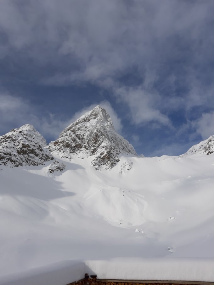 Sehr viel Schnee im Gebiet und die Verhältnisse machen einen sicheren Eindruck. Die leichte Kletterei zum Gipfel war heute gut ohne Steigeisen machbar. Ca die Hälfte der Abfahrt im tollen Pulverschnee, der Rest vom Wind bearbeitet, aber gut zu fahren.
