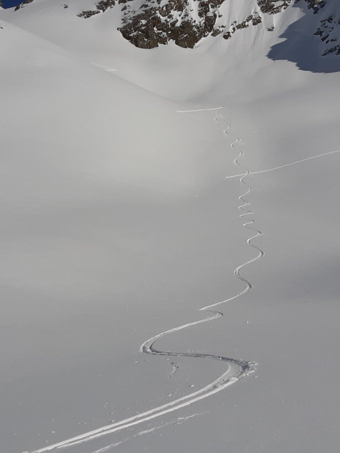 Perfekte Verhältnisse, Pulver von oben bis unten. Die Tour lässt sich ohne Gletscherausrüstung machen, mit Ski bis Gipfel, letzte 50Hm evtl Harscheisen nützlich.