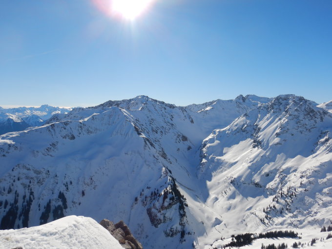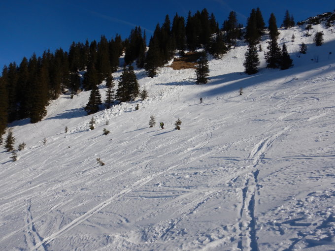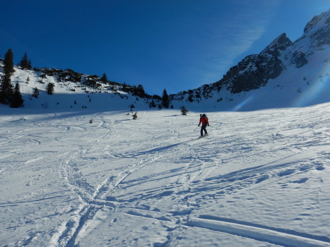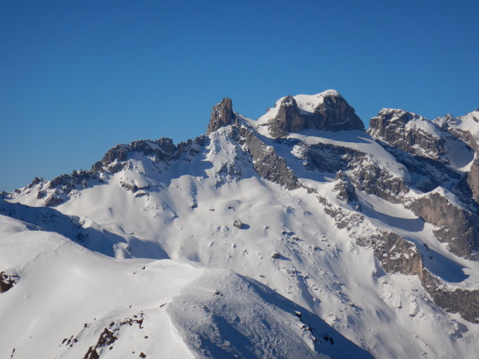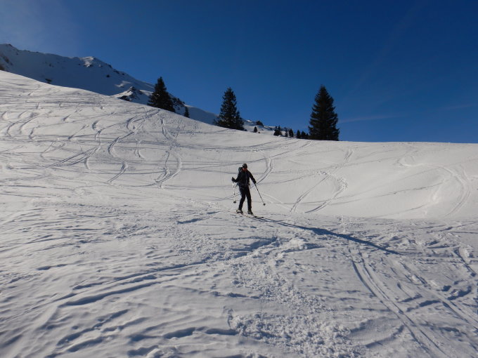 Es hat noch genügend Schnee, jedoch unten gefroren und ober gepresster und recht verspurter Pulver. Sonst Traumverhältnisse.
