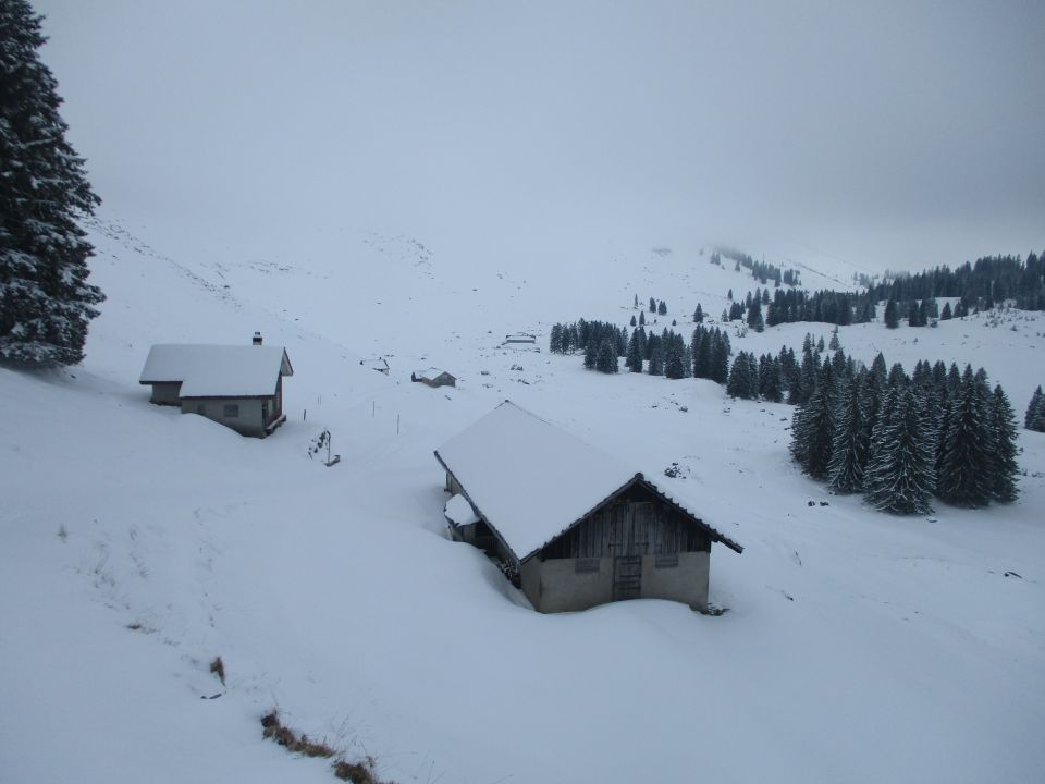 Die meiste Zeit über musste im unberührten Neuschnee gespurt werden. Die Fußspuren zu Beginn halfen praktisch nicht. Oberhalb der Jakobskapelle traf ich einen Wandersmann ohne Schneeschuhe, dessen Spur mir die Orientierung bis zum Gipfel erleichterte, denn was hoffnungsfroh begann (siehe Bilder) endete mit Ankunft auf dem Kamm beim (geschlossenen) Gasthaus Scheidegg im Whiteout. Eine Herausforderung war dann der Abstieg unter diesen Bedingungen gen Schwägalp durch unverspurtes Gelände. Dort kamen mir zwei mit Hund von Urnäsch her entgegen. von dieser Spur konnte ich immerhin bis zur Abzweigung P. 1557 profitieren, danach wieder weiter durch jungfräuliches Weiß. Diffuse Sicht vom Feinsten, Konturen und Hangneigungen waren kaum mal erkennbar. Unterhalb vom Langälpli besserte sich die Sicht ein wenig, da ich dort wieder unterhalb der Wolkenglocke unterwegs war. Der Säntis zeigte sich den ganzen Tag über nicht, ebensowenig gab es Aussichten nach Norden, übers Appenzellerland hinweg zum Bodensee.