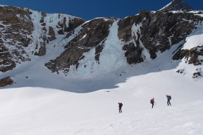 Als Abfahrt wählten wir heute den Übergang ins Val Pintga. Ca. 6 m Kletterei über eine Felsstufe, um auf die Fuorcla zu kommen. Dann herrliche Abfahrt ins Val Russein bis hinunter nach Barcuns Dado (1180 m). Sehr große Lawinenkegel aus dem Hochwinter im Val Russein. Diese sind jetzt nocheinmal gut überschneit worden. Nur einzelne Nassschneelawinen zu queren.