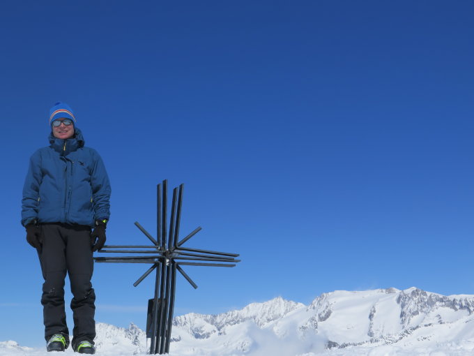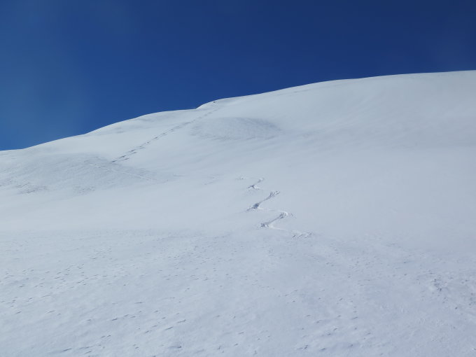 Der Gipfelgrat war auch abgeblasen und dem endsprechend hart. Ich hatte etwas oberhalb des Sattels ein Skidepot gemacht. Auf dem Gipfel blies der wind von norden her mit ca. 40 km/h.