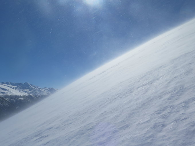 Beim Start um 8.40 empfing der Wind einem. Er Jagte durch das Dorf. Dazu hatte es über Nacht geschneit. Einsinktiefe mit den Skis je nach dem 10-20cm. Darunter relativ hart. Im Wald war der Wind nicht mehr so stark. Aber bei Altstafel spürte man seine volle stärke. Ca. 40-50 km/h von Richtung nord-ost. Dort bei diesem Wind war der Schnee hart. Weiter oben lies der Wind etwas nach und blies auch nicht ohne pausen ( Windschatten Sidelhorn) Es hatte immer wieder harte Stellen oder Presspulver.