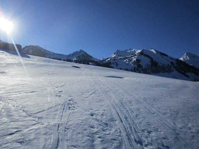 Traumhaft...beim Start ca 30-50cm Altschnee, im Wald und auf der Alpstrasse noch genügend Schnee, wird aber bei diesen Temperaturen langsam schwinden, z.Z noch keine Tragstrecken.