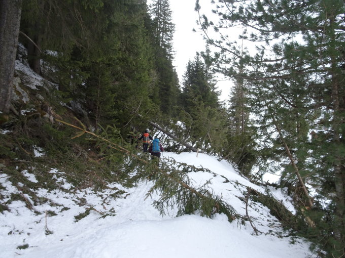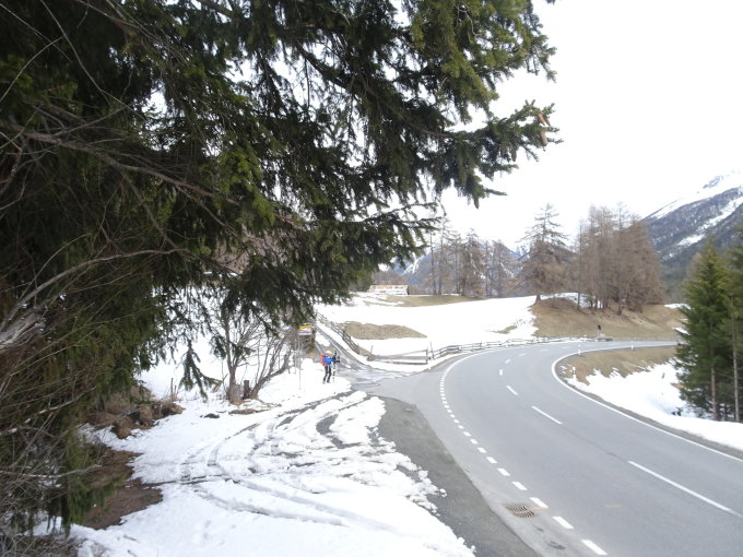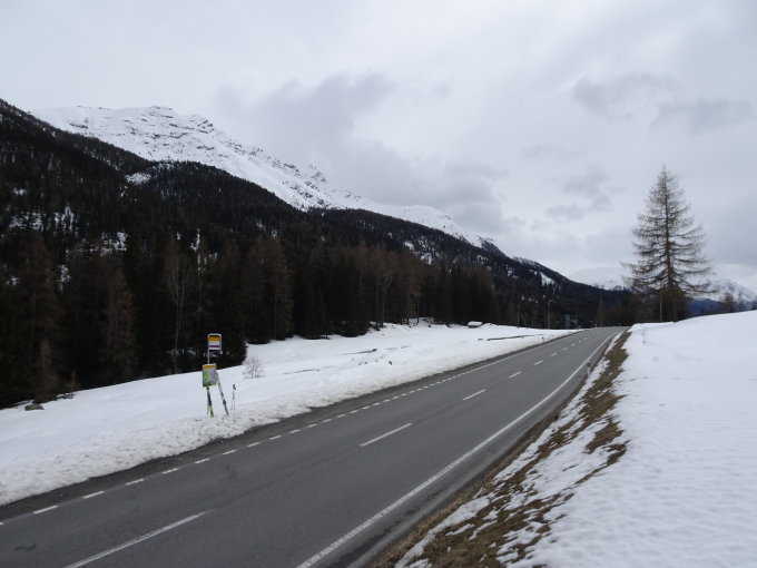 Teufi bis Grialetschhütte: Derzeit noch längst genug Schnee auf der Asphaltstrasse. Im Wald nach der Teufi hat es einige Fichten geknickt, und zwar vom Druck der Lawinen, die von Seiten Stillberg / Rüedisch Tälli runtergedonnert kamen. Der Bach Richtung Grialetschhütte öffnet sich bereits an einzelnen Stellen.