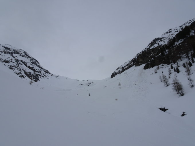 Abfahrt via Val Pülschezza nach Prazet: Auf dem Überbleibsel vom Vadret da Sarsura noch Pulverschnee und bis knapp vor der Talbiegung nach Südosten guter Schnee. Danach wurde der Schnee schwer. D.h., der Altschnee war weiterhin kompakt und auch tragend, aber der Neuschnee von letzter Woche hielt nicht. Oben hatte es zu viel und zu nasser Neuschnee, so dass man gut 20cm einsinken konnte. Im mittleren Teil war es ok und unten am Bach entlang wurde letztlich Klebschnee daraus. Unterhalb der Alp Pülschezza sind wir auf den Südosthang gekommen: Dort ist der Schnee so gut wie weg, so dass ca. mit einer Viertelstunde Fussmarsch gerechnet werden muss. Es sieht nicht so aus, als würde sich dies nochmals ändern.