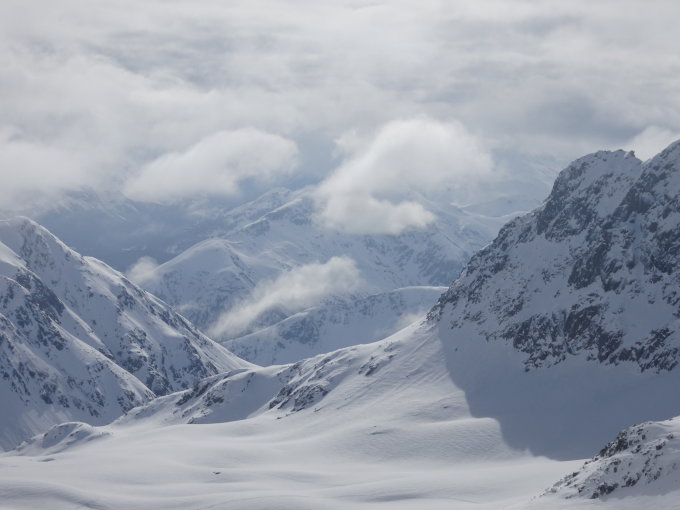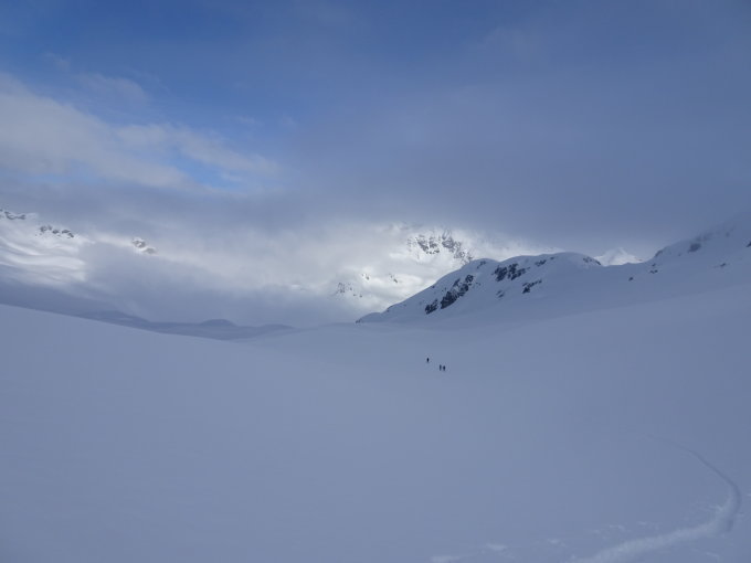 Grialetschhütte bis Fuorcla Sarsura: Durchgehend viel Schnee. Abfahrt zu P2370 ohne Steinkontakte. Schöner Aufstieg in Fuorcla. Wir sind ganz oben wegen den Triebschneeansammlungen ganz links (östlich) hoch gegangen und kamen so bei 2970 auf den Grat. Leider waren alle Gipfel im Nebel.