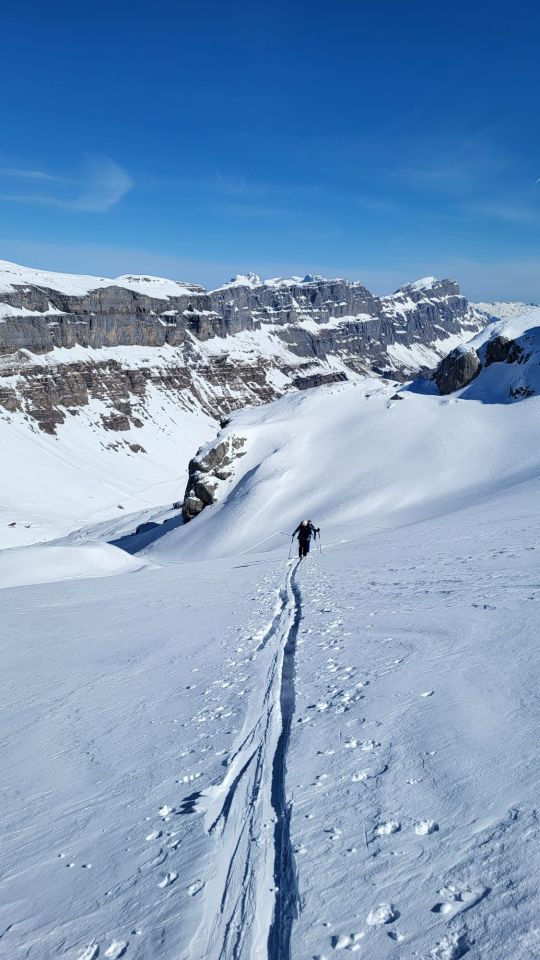 grand beau. vent léger à modéré. Vent plutôt modéré + au Clariden. Neige dure ou croutée en bas. Poudre après le Tufelsjoch.