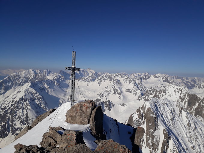 Zur Route (seit den letzten Schneefällen keine Spur): Nordseitige Einstiegsrinne tiefer Triebschnee, auf der Südseite dann guter, griffiger Firn. Die Kletterstellen sind frei, Markierungen gut erkennbar. 1:45 h für den Anstieg / 45 min runter.