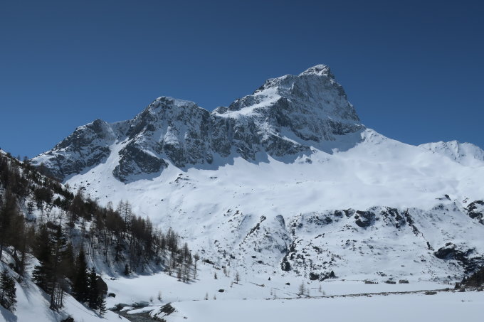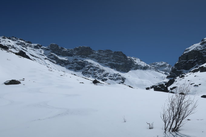 Anfangs ca. 120Hm Ski tragen, bis zu den Kehren auf ca. 1600m, ab dort dann Schnee am Waldweg. Manchmal muss man kurz abschnallen. Es liegen ein paar Bäume über die Strasse und die Brücke ist aper. Kurz vor Tga dann auch die Strasse nochmals. Stört aber nicht wirklich, kostet aber etwas Zeit.