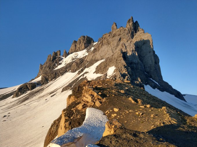 Bis Schlossberglücke problemlos, oben noch etwas Schnee. Über Bergschrund geht im Moment noch wenn man nach Nordosten quert. Bis Spannortjoch problemlos. Einstieg: Über Schnee zum Fixseil. Dann noch etwas Schnee. Kletterstellen schneefrei. Ab etwa 3'100 m noch Schnee, kann teilweise im Westen umgangen werden.