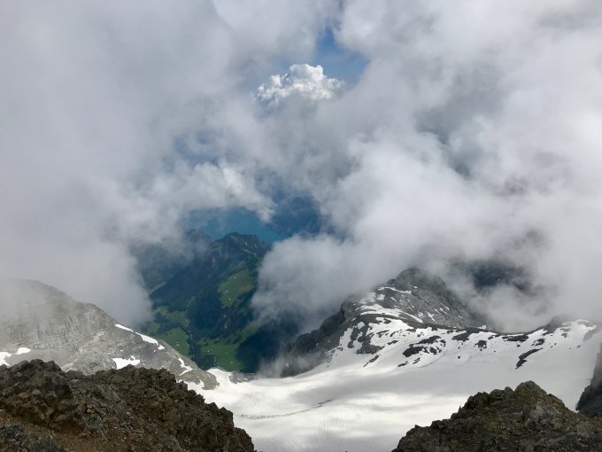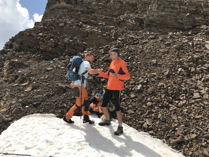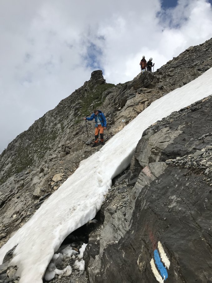 Ab ca. 2'300 m liegt durchgehend Schnee, sodass man sich eher an den Steinmännchen orientiert als an den halbverdeckten Markierungen. Als kritisch erweist sich die steile verschneite Stelle unter dem Sattel unterhalb P. 2'798 m. Der Schnee wird schon vor dem Mittag weich und hält an dieser Stelle schlecht. Leider hat er unter mir nicht gehalten und ich fuhr ziemlich schnell ca. 30 m runter direkt auf den Fels zu. Ein paar Schürfungen, ein kleiner Schock, sonst nichts schlimmes. Trotzdem zeigt dieses Vorkommnis, wie heikel gewisse Schneepassagen sein können. Ich würde daher empfehlen, statt den Schneehang den Fels links davon zu nehmen (siehe Foto). Stöcke und womöglich Pickel sind sicher nicht abwegig.
