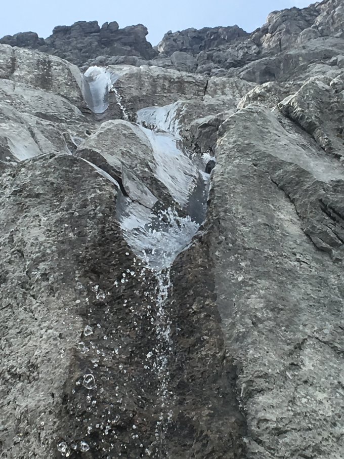 Das 1. Schneefeld nach der Rampe kann unten umgangen werden. Das Ausstiegsschneefeld hatte guten Trittfirn ohne Blankeisstellen.