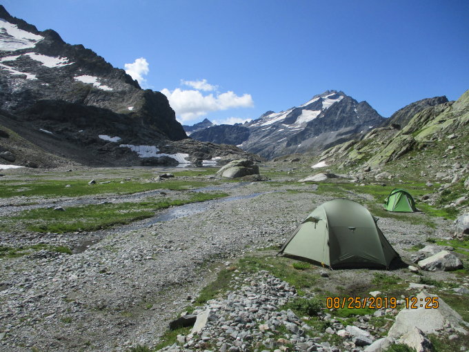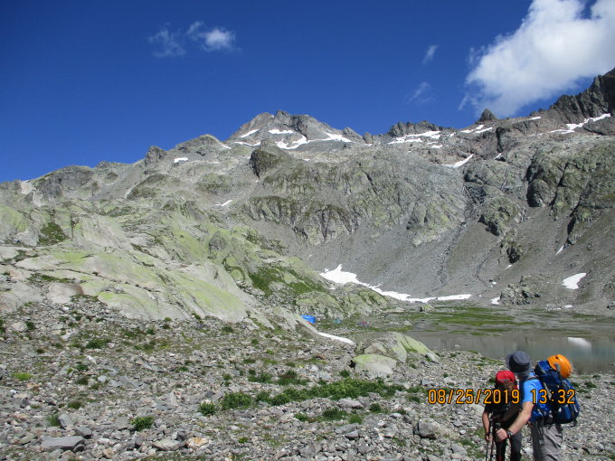 Wir haben uns für eine Biwaktour mit Start zu Fuß aber Golzeren (832 m) entschieden. Bis zur hierfür hervorragend geeigneten Schwemmebene mit dem Tschingelseeli (2443 m) sind mit schwerem Gepäck gut 6 Nettostunden zu veranschlagen, wobei der heftigste Anstieg ganz zum Schluss ab dem Brücklein beim Ligegg (1899 m) aufwartet. Diese Vorbedingungen lassen einen Ausschluss von allzu vielen Mitstreitern mit gleichem Plan erwarten. Um so überraschter waren wir, dass wir dort oben eine Gruppe von Strahlern antrafen, die sogar mit einem Küchenzelt ausgerüstet waren.