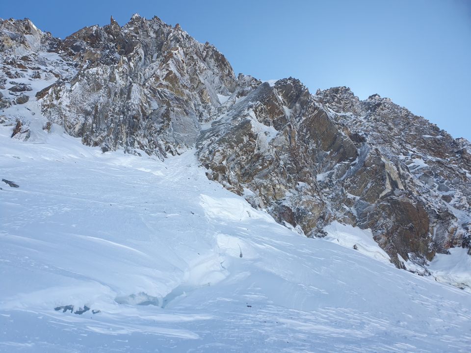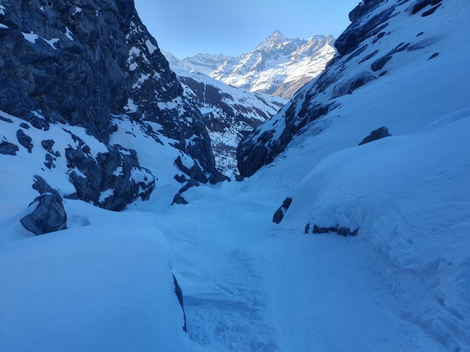 Dennoch möchte ich auch kurz betonen, dass es auf dem W-Grat Stellen gibt, wo ich mir kürzere Ski am Rucksack gewünscht habe. V.a. durch einen Spalt zerkratzt man die Ski ausnahmsweise mal auf die oberen Seiten. Kurz vor dem Gipfel musste ein Felsaufbau nördlich abschüssig umgangen werden; hier bin ich wegen den Ski noch ein paar Meter auf einem Schneeband gekrochen. Aber wo ein Wille ist, ist immer auch ein Weg. Ich möchte diesen Übergang deswegen sicher nicht missen. Denn es sind genau solche unvorhergesehene Situationen, die eine Tour zu einem unvergesslichen Erlebnis machen!